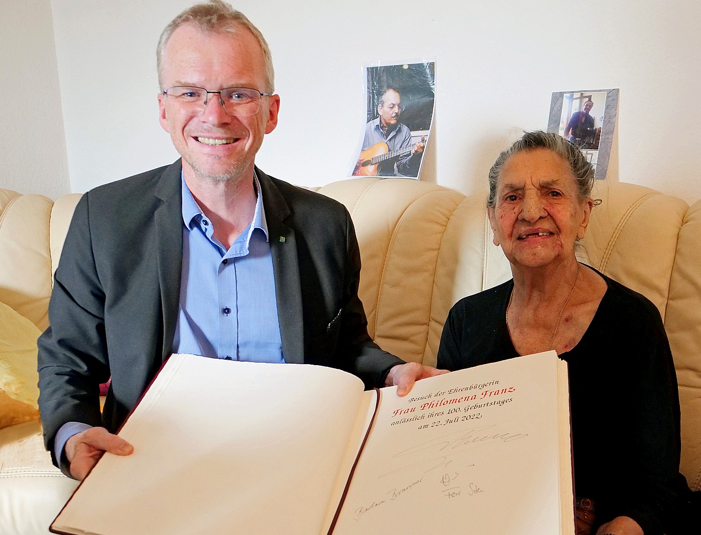 Die Ehrenbürgerin Philomena Franz wird 100 Jahre alt. Bürgermeister Frank Stein gratuliert ihr bei einem persönlichen Besuch – und erinnert an das Lebenswerk der Holocaust-Überlebenden.
