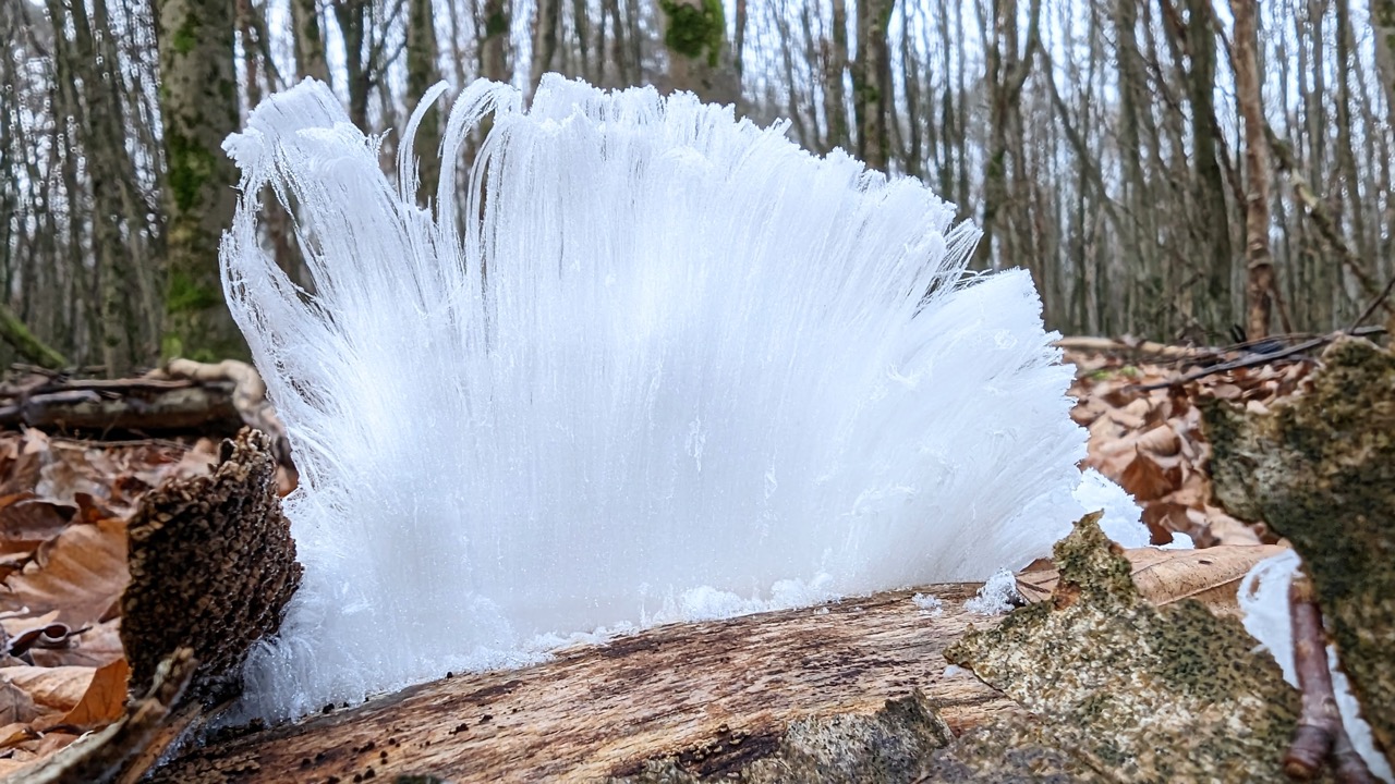 Haareis ist ein Naturphänomen, das wahrscheinlich auf einen Baumpilz beruht, der im Totholz vorkommt. Wenn es zunächst viel regnet, dann Windstille und Temperaturen um den Gefrierpunkt herrschen, dann können aus den Gasen der Pilze bizarre Eisformationen entstehen, erläutert unser Leser Simon-Sebastian Flosbach. Es dürfe auch nicht zu kalt werden, dann sonst erfriert der Prozess bereits im Holz selbst.