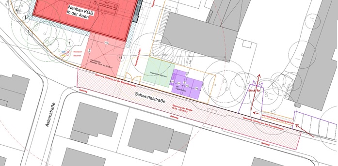 Der Zugang über die Schwerfelstraße zum Haupt-Tor der Schule erfolgt in dieser Zeit über den Lehrerstellplatz und das Schulgelände. Der Lehrerstellplatz ist von Fahrzeugen freizuhalten.