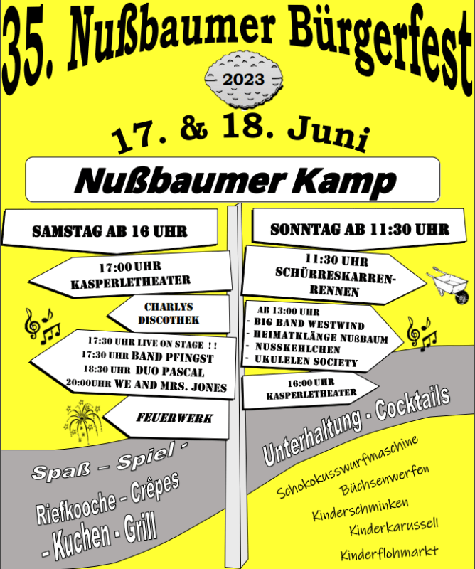 Der Nußbaumer Männergesangsverein tritt ebenso auf, wie der Nußbaumer Damenchor „Nußkehlchen“ und die Nußbaum Ukulele Society. Daneben wird die Bigband West Wind auftreten und als Topacts sind Samstagabend eine junge „IGP Band“, das allseits bekannte „Duo Pascal“, sowie die Band „We and Mrs. Jones“ aus Köln engagiert.