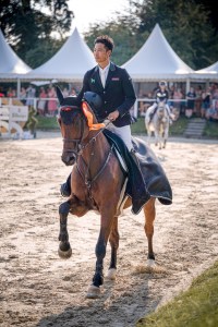 Taizo Sugitani konnte sein Glück kaum fassen und winkte mit seinem Helm ins Publikum. Der japanische Springreiter gewann zum Abschluss der Bergisch Classics den Großen Preis von Bergisch Gladbach, das Sonja-Kill-Gedächtnisspringen.