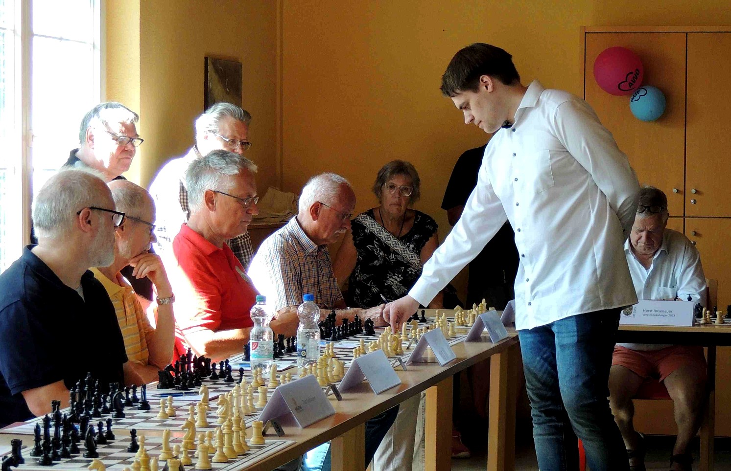 Bei Temperaturen um 30 Grad trat der sympathische Großmeister gegen 30 Mitglieder der BSF gleichzeitig an, zog seine Runde, machte Zug um Zug und zeigte seine ganze Klasse gegen unsere Mitglieder