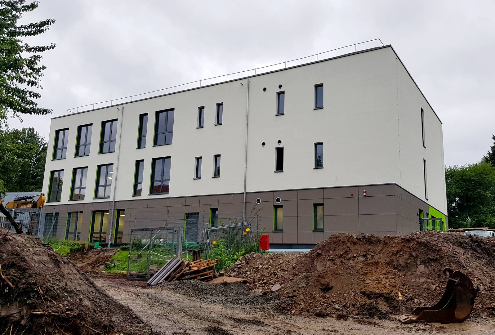 Die Sofortschulen in Hebborn (Foto) und Refrath sind rechtzeitig in Betrieb gegangen und bieten großzügige Angebote für die OGS. Für die Wiederherstellung der Außenanlage wird in Hebborn noch Zeit benötigt.