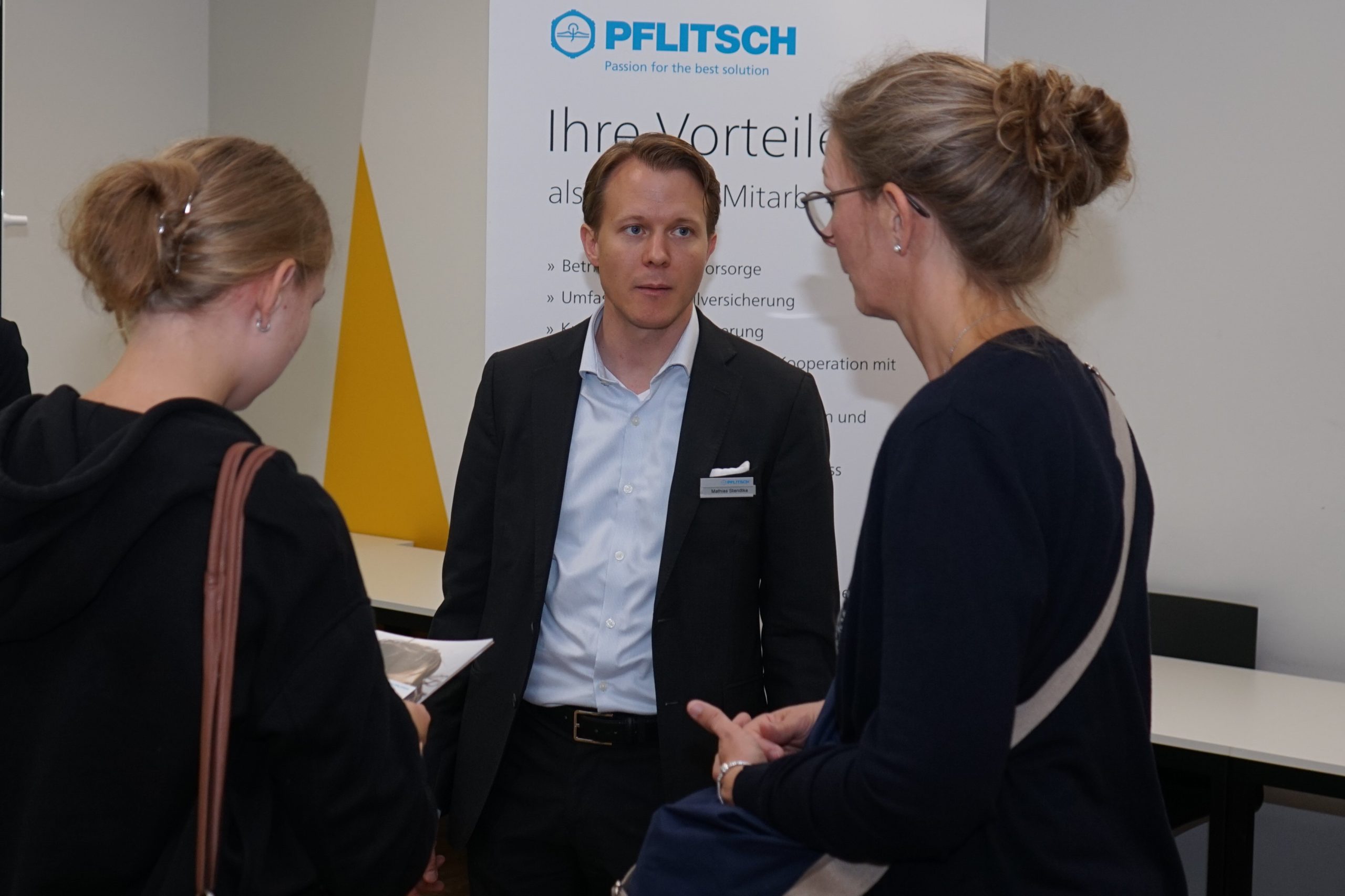 Pflitsch: „Wir hatten schon einige wirklich gute Gespräche hier.“ Mit ihm am Stand ist Personalleiterin Nora Gerdes: „Wir haben gemerkt, dass das duale System die neuen Führungsfachkräfte besser an das Unternehmen bindet und wir haben ja das Ziel, die Leute lange bei uns zu halten“, begründet sie die Kooperation mit der FHDW.
