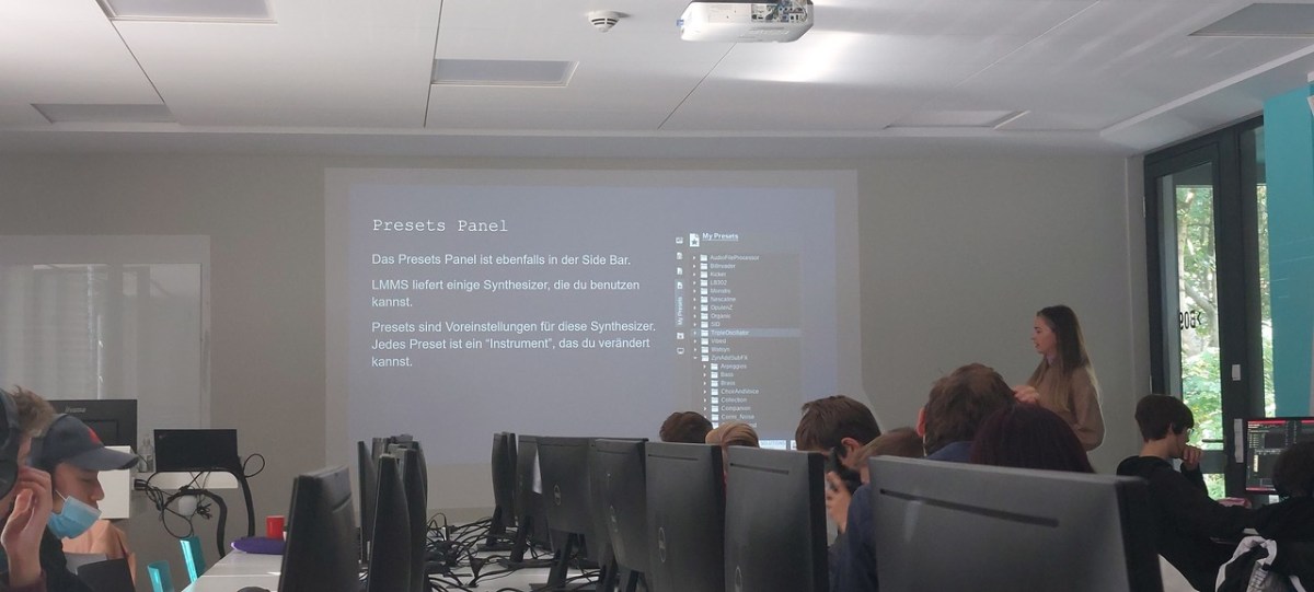 Zum Inhalt der Woche gehört ebenfalls, die verschiedenen Programme kennenzulernen und sich mit den Grundlagen der Harmonik zu beschäftigen, um die eigenen Musiktracks zu programmieren und zu verfeinern. Dafür wird das kostenlose Programm Sonic PI genutzt, für die Tontechnik setzen die Schülerinnen und Schüler die freie Software FL Studio ein.