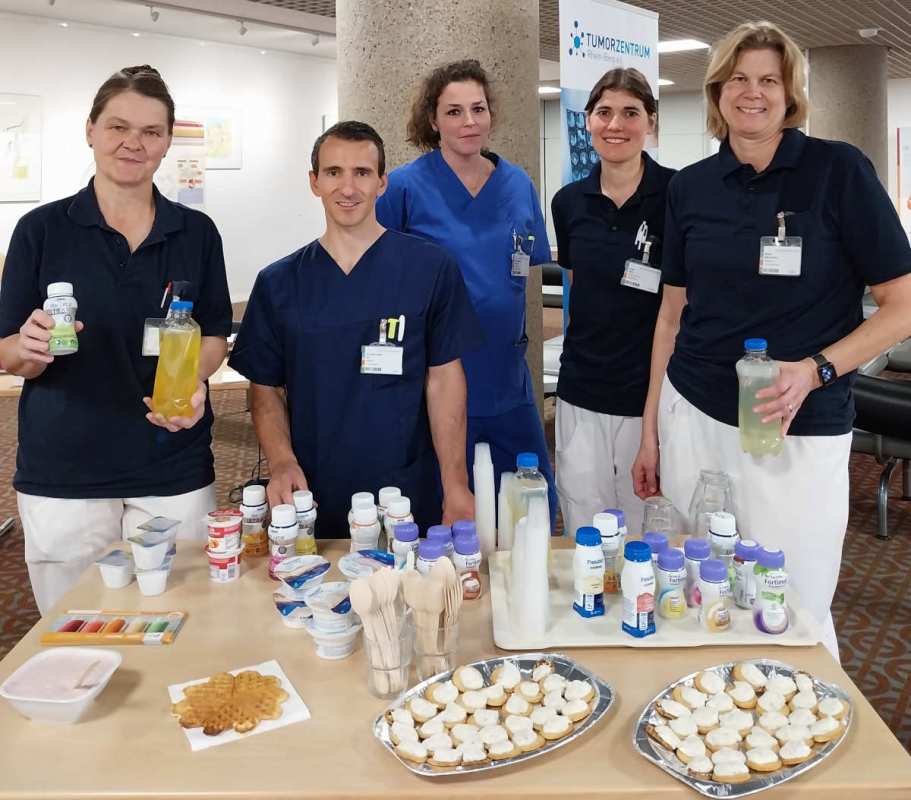 Verkostung von hochkalorischen Snacks und eiweißreichen Waffeln für Besucher, Patienten und Mitarbeitende, v.l. Elisabeth Niemand, Dr. Jamal Ali, Susanne Lindner, Edda Stein, Mirjam Miczka.