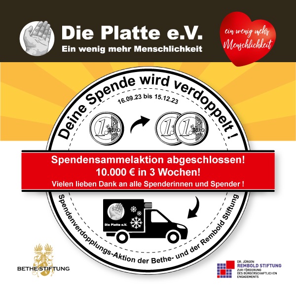 Innerhalb von nur drei Wochen hat der Verein Die Platte e.V. 10.000 Euro für ein dringend benötigtes Kühlfahrzeug eingesammelt. Damit können gespendete Lebensmittel ohne Untebrechung der Kühlkette an Bedürftige geliefert werden. Unterstützt wird die Spendenaktion von der Bethe-Stiftung und der Rembold Stiftung mit jeweils 5.000 Euro.