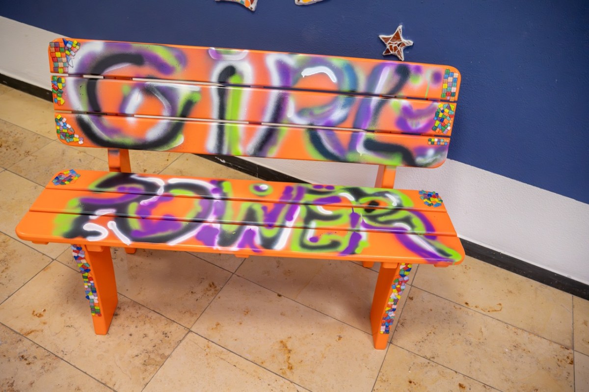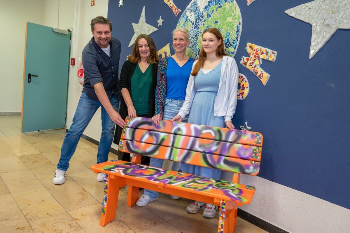 Kornelia, Julius, Hedda und Hanna aus der 6d gestalteten eine Bank mit dem Schriftzug „Partnerschaft auf Augenhöhe“. Hier war der Hintergedanke, dass jegliche Partnerschaft auf Augenhöhe stattfinden muss – was ebenfalls wieder inhaltlich passend ist, denn im Schullogo findet sich auch ein offenes Auge wieder. Zudem symbolisieren die weit geöffneten Augen, dass man nicht wegschauen soll. Das Schulkürzel kommt auch vor: PKG – Partnerschaftlich – respeKtvoll – Gleichberechtigt. Die jungen Künstlerinnen und Künstler wurden von ihrer Lehrerin Britta von Krüchten unterstützt.