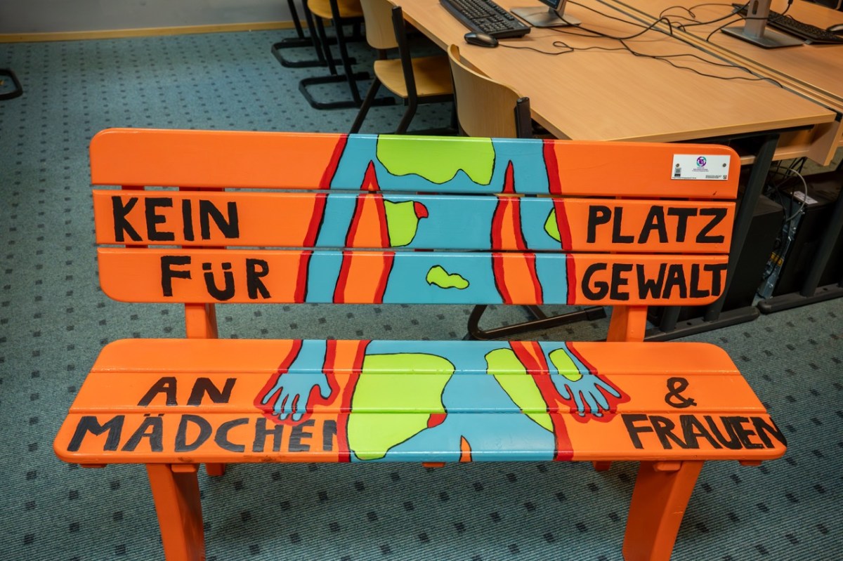 Die Schülerinnen und Schüler machten sich Gedanken, wie sie eine Bank zum Thema Gewalt gegen Frauen gestalten können. Heraus kam ein sehr künstlerisches Ergebnis mit viele Frauengesichtern unterschiedlicher Herkunft. Hintergedanke bei der Gestaltung war, dass jede Frau betroffen sein kann, unabhängig von der Hautfarbe, dem Alter, der Herkunft, ob arm oder reich. Wichtig sei, dass betroffene Personen zusammenhalten und man sich bewusst machen, dass sie niemals allein sind. Die Bank wurde im Kunst-Kurs gestaltet.