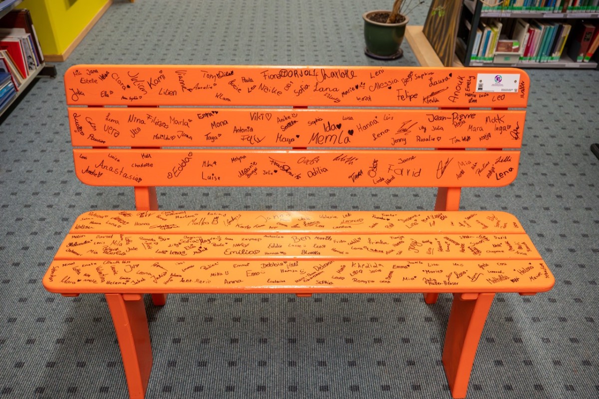 Auf der zweiten Bank haben 182 Menschen unterschrieben. Durch die Unterschrift wird ein interaktives Zeichen gesetzt. Die Schülervertretung hat sich in dem Projekt besonders aktiv eingebracht. Die Idee der Schülervertretung war es, eine Möglichkeit zu schaffen, bei der alle, die gegen Gewalt an Frauen und Mädchen sind, durch ihre Unterschrift ihre Unterstützung ausdrücken können. Die orangene Bankfarbe steht mit den schwarzen Unterschriften in Kontrast und betont die klare Unterstützung dieses Statements.