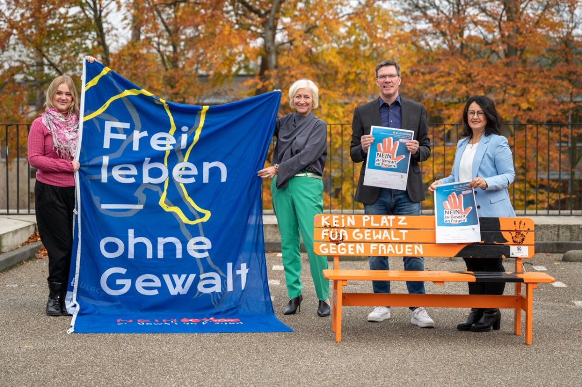 Landrat Stephan Santelmann macht mit Anja Möldgen (2.v.l.), Süheyla Bas (r.) und Ann-Kristin Jäger (l.) aus der Gleichstellungsstelle des Kreises auf den Tag gegen Gewalt an Frauen aufmerksam.