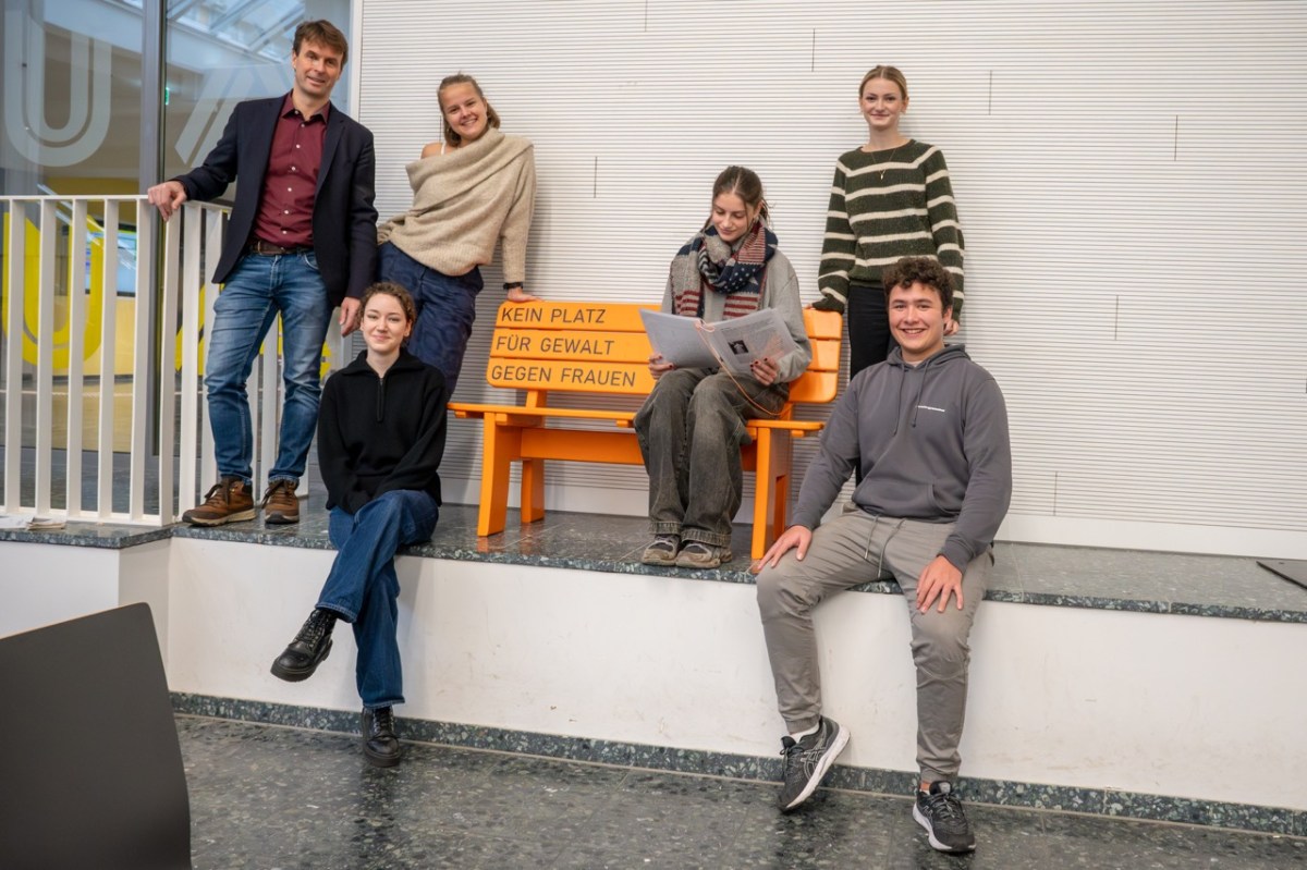 Sarah, Katharin, Carlo, Antonia und Schülersprecherin Jule haben sich für eine schlichte Variante entschieden. Die Bank soll ein Platz zum Verweilen und Schmökern sein. Der Hintergedanke bei der Gestaltung ist, dass die Bank als Leseplatz genutzt wird und sich alle mit dem Thema „Keine Gewalt an Frauen“ auseinandersetzen, inspiriert durch feministische Literatur und Biographien berühmter Frauen. Die Lebensgeschichten wurden ausgedruckt und an die Bank angeheftet.