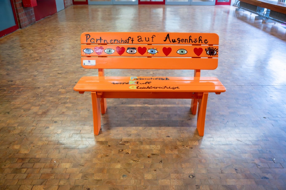 Die Schülerinnen und Schüler gestalteten gleich drei Bänke, dekoriert mit orangenen Ballons und Plakaten. Es handelt sich um ein Gemeinschaftsprojekt von Schülerinnen und Schülern unterschiedlichen Alters: Das Projekt „Orange Bank“ wurde stufen- und fächerübergreifend gestaltet. Sowohl die Schülerinnen und Schüler der Garten-AG, von Jahrgang 5 bis 7, als auch die der Jahrgangsstufe 10, in Kunst und praktischer Philosophie, gestalteten kreativ die Bänke und aufklärende Plakate.