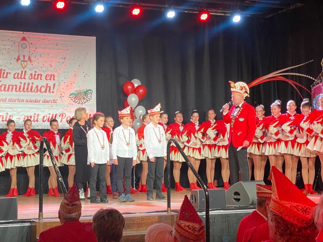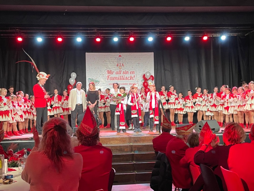 Auch das Kinderdreigestirn der Stadt Bergisch Gladbach, traditionell ebenfalls von der Grossen Bensberger gestellt, betrat die Bühne und wünschte den anwesenden Jecken eine tolle Session. Prinz Anton I. (Hombach), Bauer Miguel (Jäger) und Jungfrau Paulina (Franken) haben nach den ersten Auftritten der letzten Wochen sichtlich an Professionalität gewonnen – und an einer gewissen „Frechheit“, die Präsident Furth-Quernheim zu spüren bekam. „An beidem haben wir intensiv trainiert“, erklärten die beiden Prinzenführerinnen Britta Plum-Sieß und Angelika Knechtel mit einem Augenzwinkern.