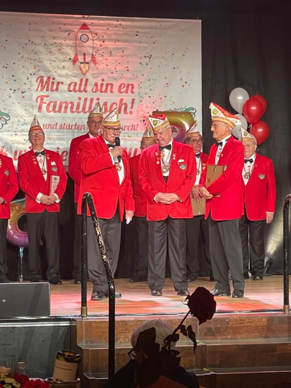 Und natürlich gab es einige bemerkenswerte Jubilare: Gleich – wie passend – elf Karnevalisten wurden für ihre 11jährige Mitgliedschaft in der GBK geehrt, Rolf Havermann für 33 Jahre, Johannes De Goede sogar für 44 Jahre. Zudem erhielten Marianne und Peter Klein sowie Norbert Söntgerath den Orden für ihre 55jährige Mitgliedschaft – sie gehören zu den Gründern des Vereins.