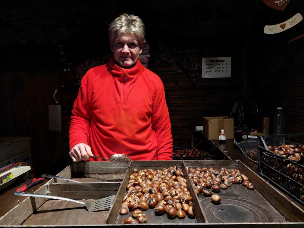 Nicht zu vergessen der Brotstand, wo man die diversen Sorten mit Röstzwiebeln und ähnlichem unbedingt probieren sollte. Die heißen Maronen sehen nicht nur hübsch aus auf ihrem Backblech, sie duften und schmecken auch gut. Eben nur in der Adventszeit!