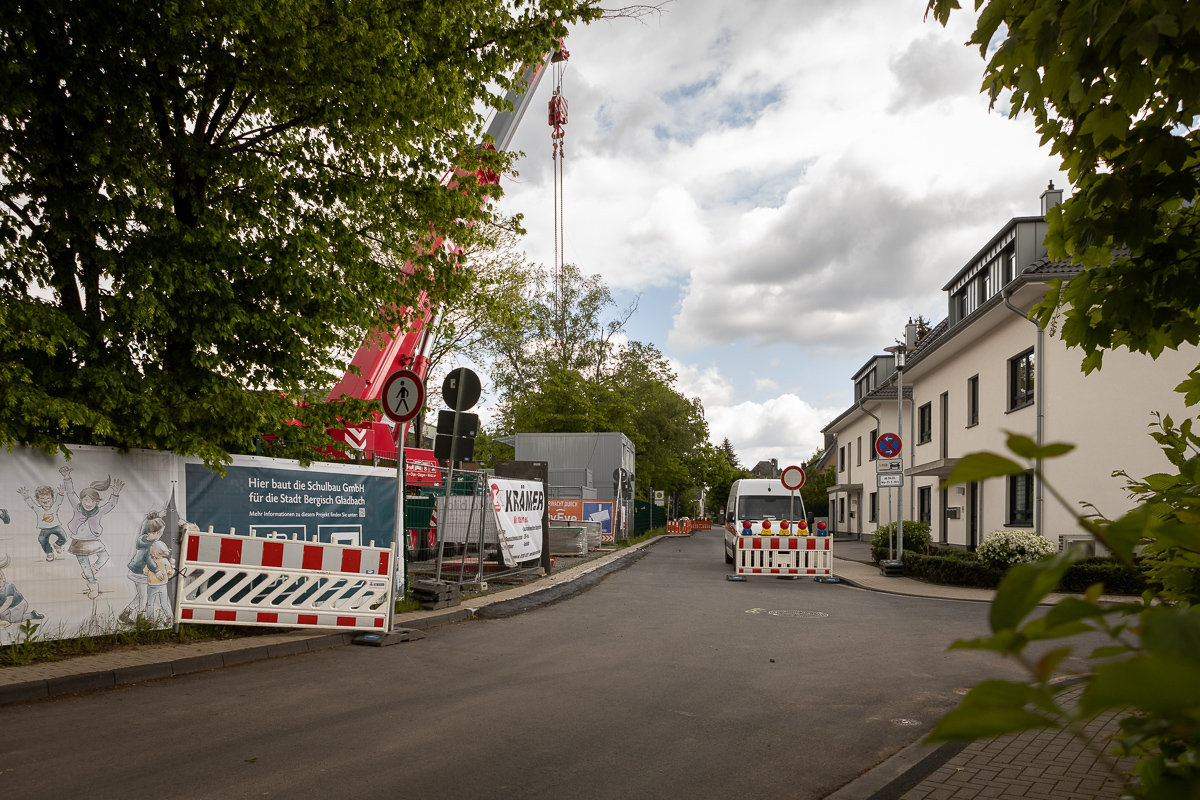 Der Bau der zweiten Sofortschule, auf dem Gelände der KGS In der Auen in Refrath, ist weitgehend geräuschlos gestartet, die ersten Module sind bereits montiert. Beim Termin vor Ort kündigt die Schulbau-Gesellschaft an, dass der abgeräumte öffentliche Spielplatz auf dem benachbarten Kirchengelände wieder erstehen soll.