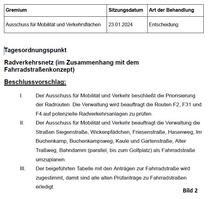 - Die Pläne für die Routenführung und Einrichtung von Fahrradstraßen zwischen Refrath und Bensberg (West-Ost-Verbindung) werden ebenfalls begrüßt.