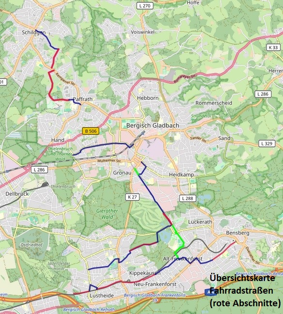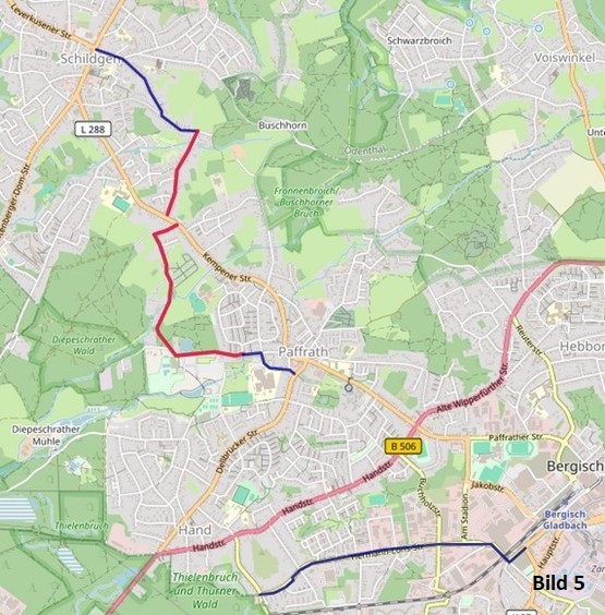 - Stattdessen sollte die verkehrsarme Route von Schildgen nach Paffrath als Schulradweg sowie als Teil der Nord-Süd-Tangente mit Prio 1 aufgestuft und so weit wie möglich als Fahrradstraße umgesetzt werden.