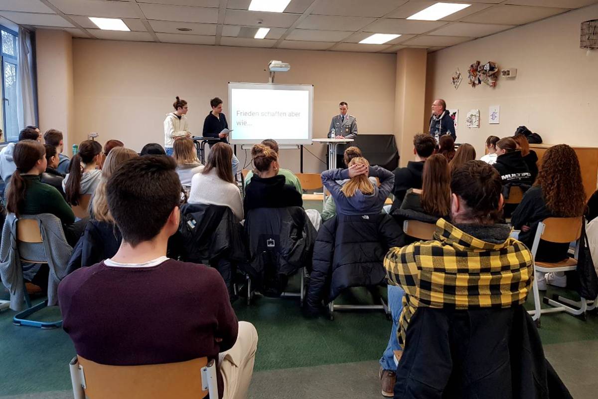 In den höheren Jahrgangsstufen wurde in den mehrstündigen Workshops intensiv diskutiert. Zum Beispiel über die Frage „Frieden schaffen und sichern – aber wie?“, zu der ein Jugendoffizier der Bundeswehr und ein Vertreter der Deutschen Friedensgesellschaft in die Schule gekommen waren, die miteinander, vor allem aber mit der Schülerschaft, sehr tierschürfend über die aktuellen Kriege debattierten.