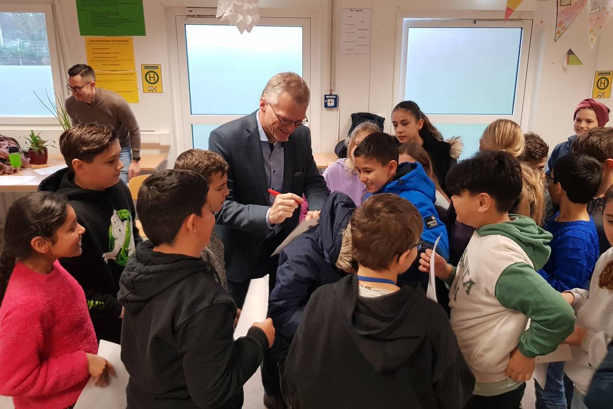 Bürgermeister Frank Stein verbrachte den Vormittag im „IGP-chen“, dem ehemaligen Verwaltungstrakt der Flüchtlingsunterkunft, in der die fünften Klassen ihr Refugium haben. Er zog durch alle Klassen, traf auf sehr gut vorbereitete Schüler:innen – und starke Autogrammwünsche.