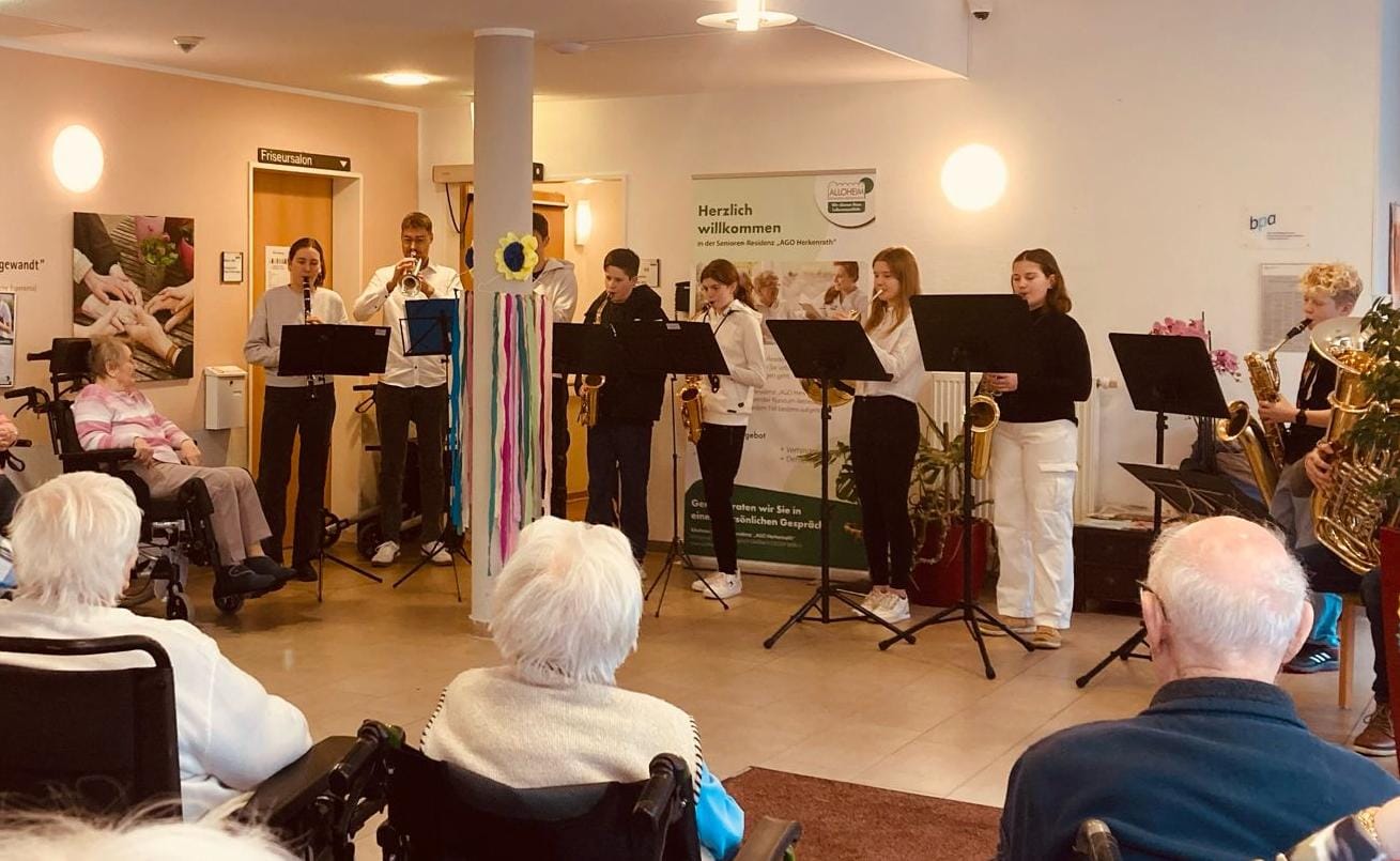 Sieben junge Holz- und Blechbläser vom Gymnasium Herkenrath, verstärkt von zwei Lehrern, präsentierten den Bewohnerinnen und Bewohnern des nahe gelegenen Seniorenzentrums AGO Herkenrath einen wilden Mix durch verschiedene musikalische Genres.