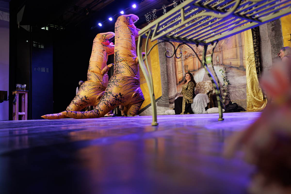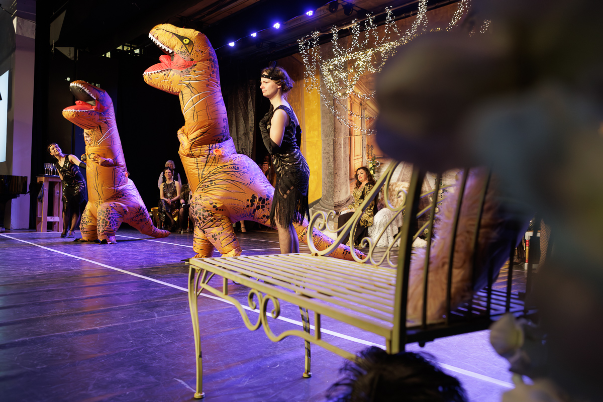 Auch die schon von der bergischen Opernproduktion „Die Fledermaus“ 2022 bekannten Dinosaurier gehen mit auf die Reise und sind bei einem Anbahnungstanz zu beobachten.