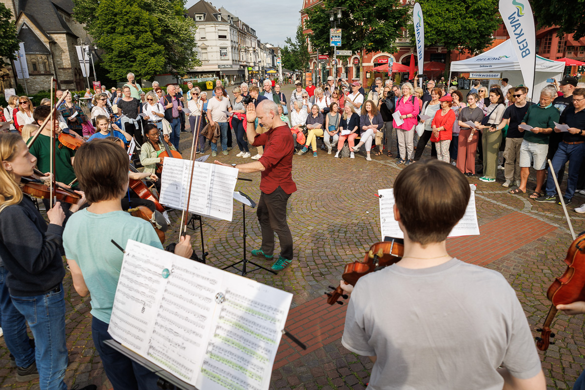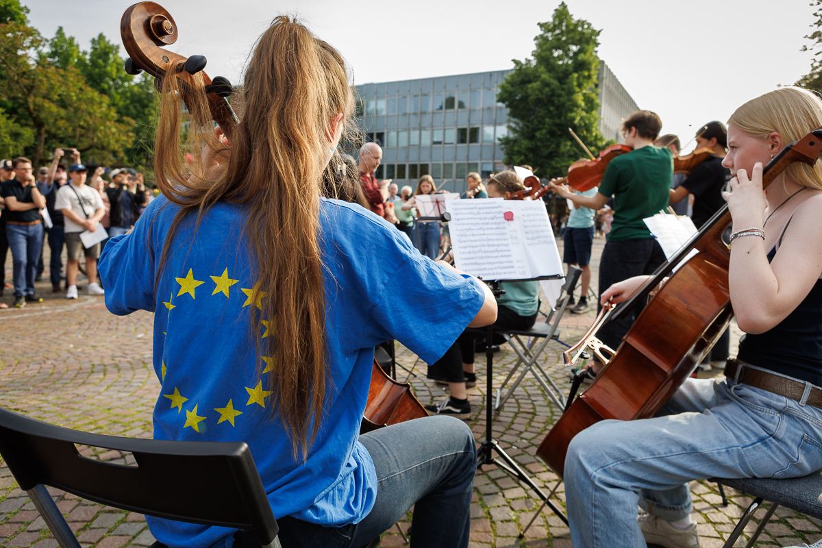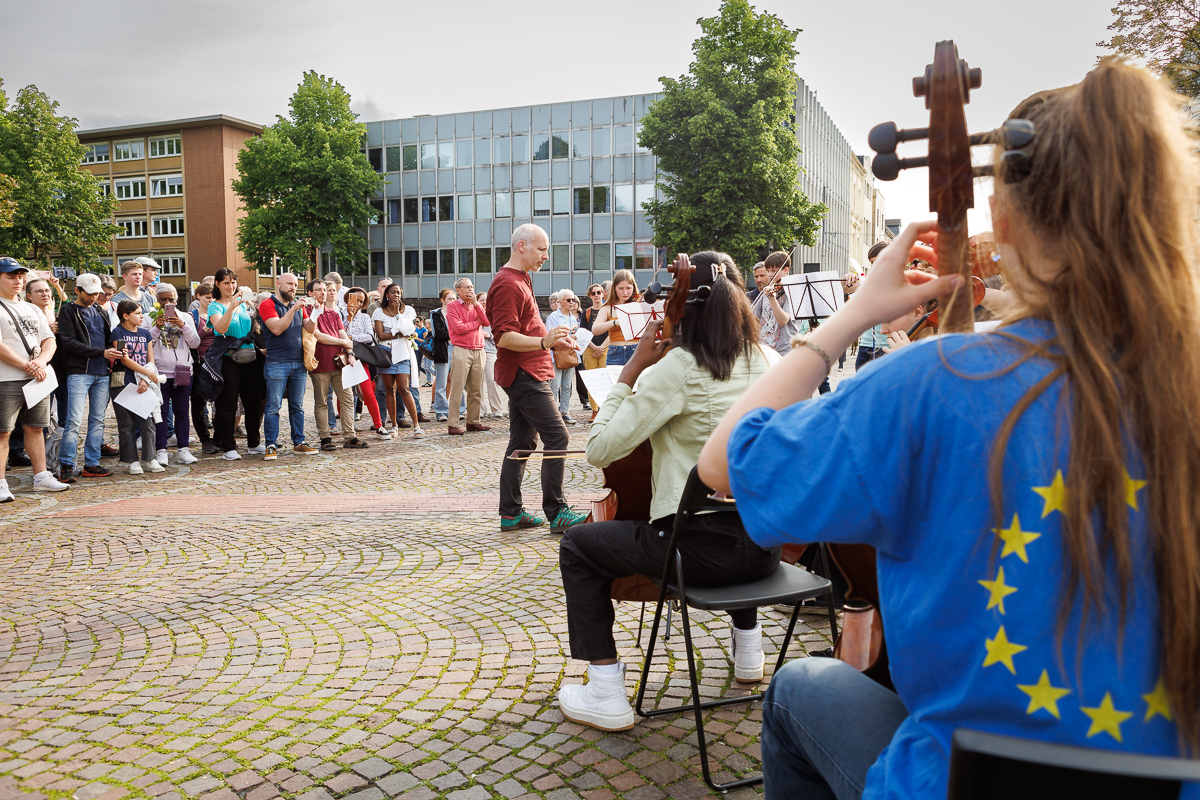 Zum Abschluss erklang die Europa-Hymne. Angestimmt von den Saitentänzern der Max-Bruch-Musikschule – in die viele der Besucherinnen und Besucher einstimmten.