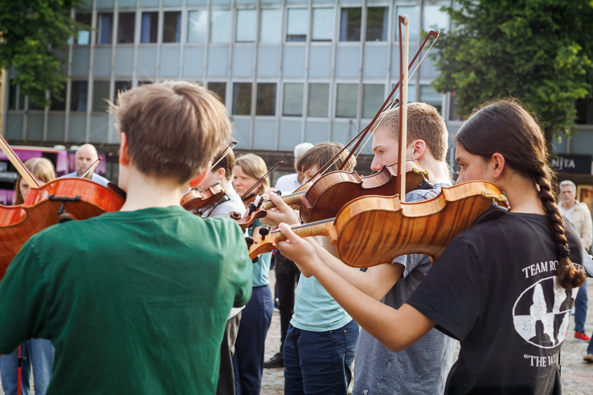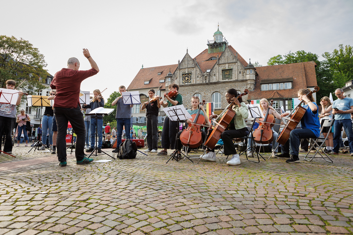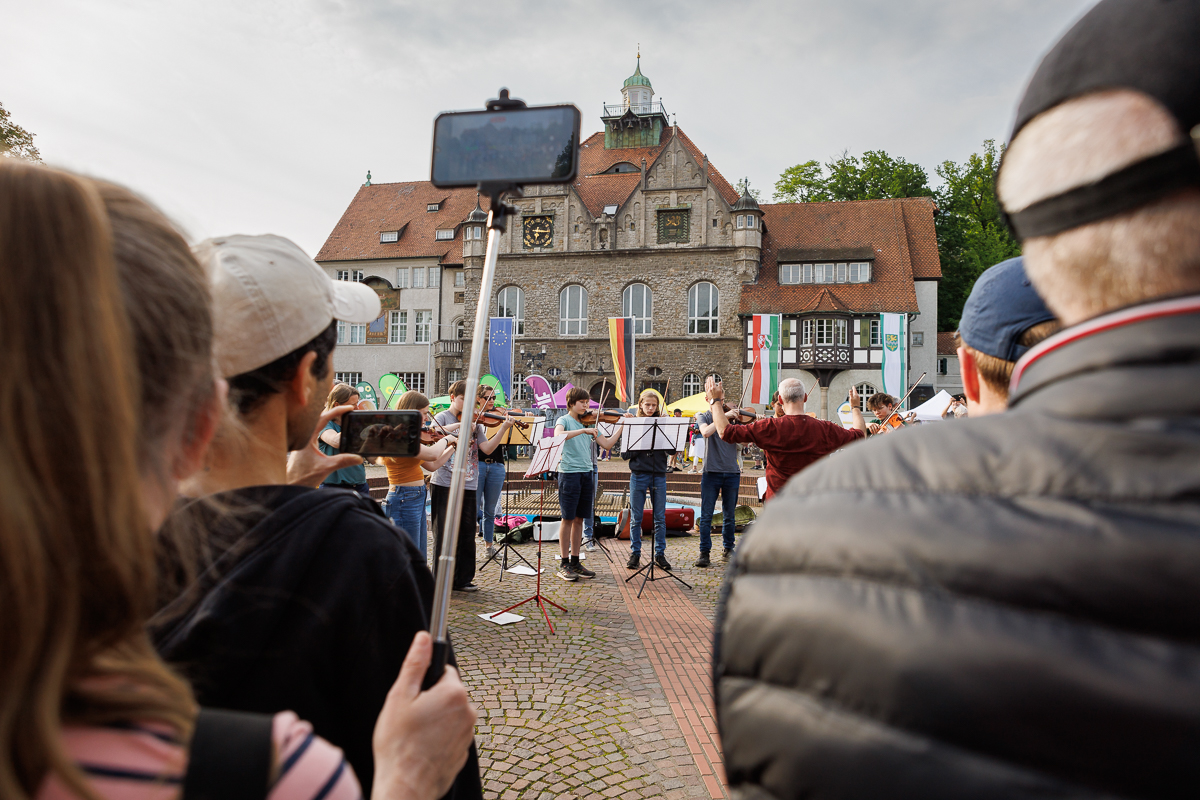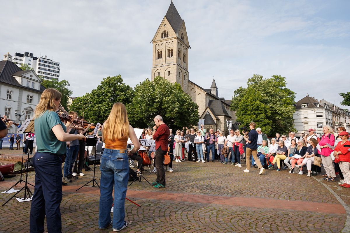 Zum Abschluss erklang die Europa-Hymne. Angestimmt von den Saitentänzern der Max-Bruch-Musikschule – in die viele der Besucherinnen und Besucher einstimmten.