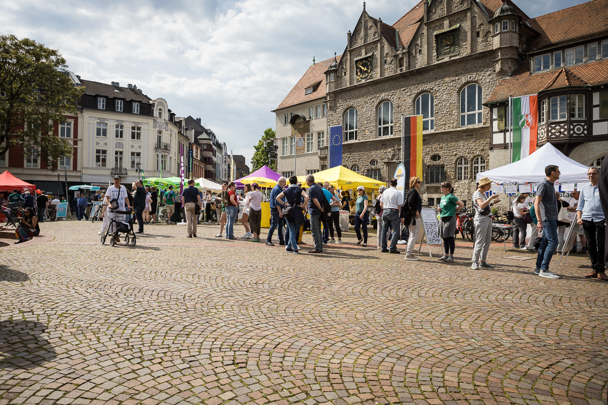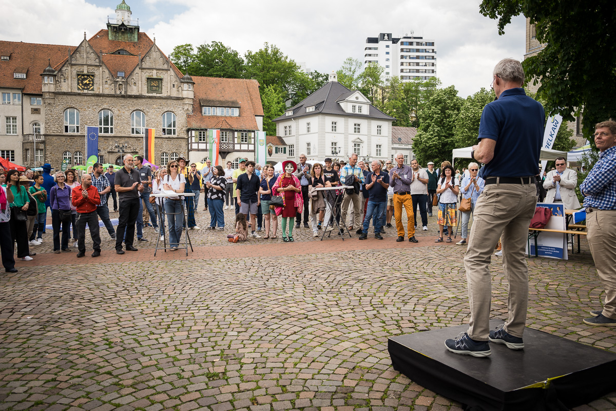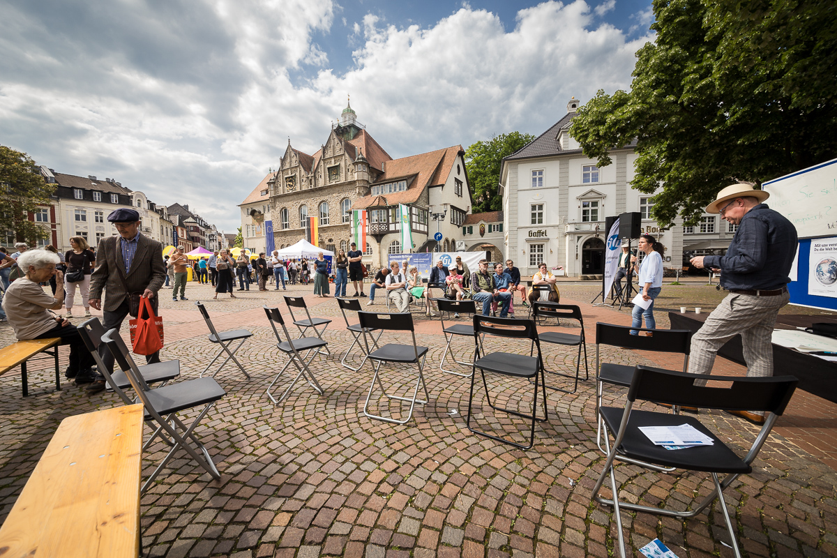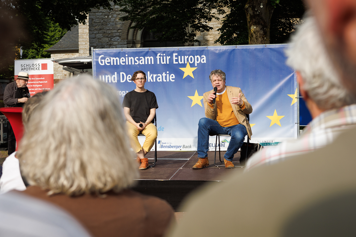 500 Besucherinnen und Besucher haben den Marktplatz am Freitag bunt gefüllt: in der SpeakersCorner und im Unterhaus, bei der Wahlmesse, beim Correctiv-Theaterstück, an der Wasserbar und am Buffet kamen die Menschen ins Gespräch und feierten bei strahlendem Wetter ein echtes Festival für Europa und Demokratie.