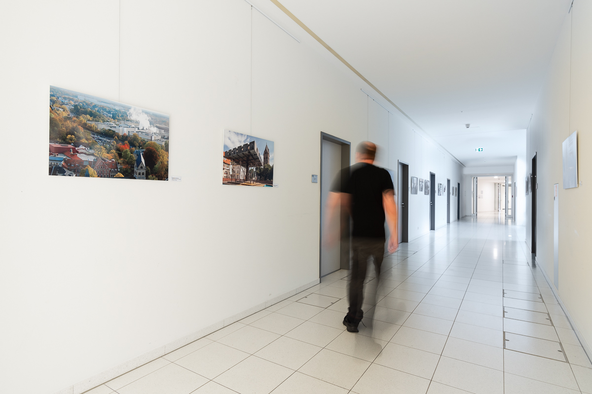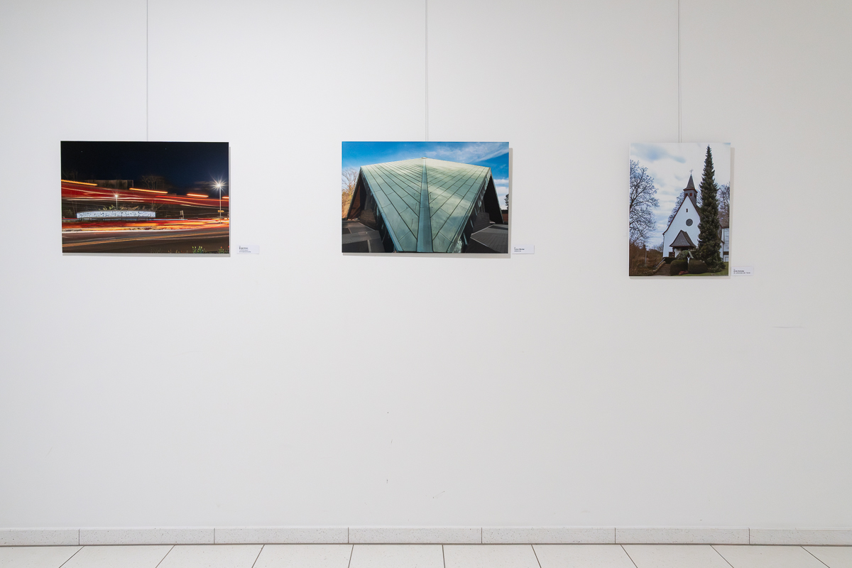 Im vorderen Teil beschäftigt sich die Ausstellung vorwiegend mit Motiven aus Bergisch Gladbach. Dabei bieten die Mitglieder des Fotoclubs ein breites Portfolio an fotografischen Techniken und Bildgestaltung auf: Langzeitbelichtungen mit Leuchtstreifen am „Turbokreisel“, spannende Perspektiven an der Zeltkirche in Refrath, Spiegelungen und Luftaufnahmen. Aber auch klassische Landschafts- und Architekturfotos.