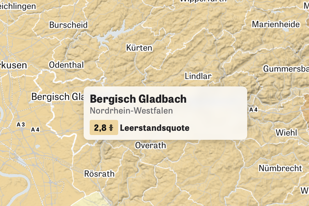 Mit 2,8 Prozent hat Bergisch Gladbach eine sehr niedrige Leerstandsquote, bundesweit liegt sie bei 4,3, Prozent. Sie liegt hier vor Ort nur knapp über dem rechnerischen Optimum, das das Institut der Wirtschaft 2,5 Prozent angibt: stehen noch weniger Wohnungen frei sind Umzüge kaum noch möglich.