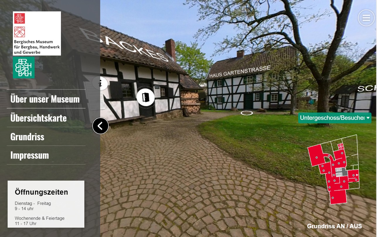 Die virtuelle Tour beginnt vor dem Hauptgebäude des Bergischen Museums, dem Türmchenhaus. Hier finden sich Besucher-Informationen zum Museum und erste Eindrücke. Eine Übersichtskarte zeigt, dass das Museum viel mehr bietet, als die Außenansicht erwarten lässt. Die vielen Werkstätten auf dem Außengelände machen neugierig auf das dargestellte Handwerk. Der Besucherstollen ist ein Highlight des Museums und macht, neben vielen anderen Details, Lust auf weitere Erkundungen.