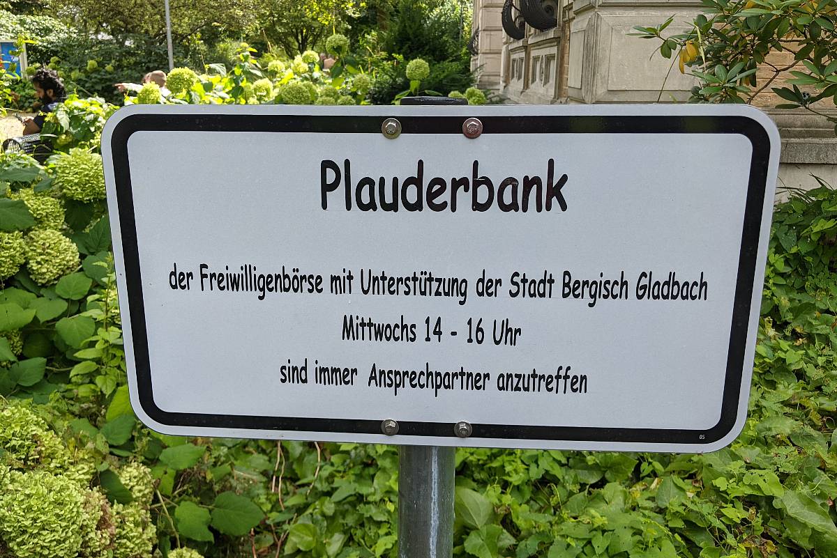 Der Name ist Programm. Im Park der Villa Zanders hat die Freiwilligen-Börse RheinBerg e.V. eine „Plauderbank” eröffnet – gemeinsam mit Herrn Bürgermeister Frank Stein. Es ist die erste Plauderbank in Bergisch Gladbach. Und wohl auch die erste im Rheinisch Bergischen Kreis.