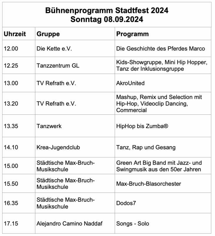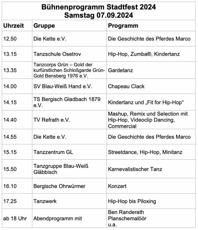 Von Freitagabend bis Sonntagabend steht Bergisch Gladbach im Zeichen des Stadt- und Kulturfests, mit dem traditionellen Stadtlauf, einer Blaulichtmeile, einem Food-Markt und einer riesigen Vereinsbörse. Auf dem Stadtfest selbst und im näheren Umfeld gibt es eine ganze Reihe von weiteren Veranstaltungen, die einen Besuch in der Innenstadt zwingend nahelegen.