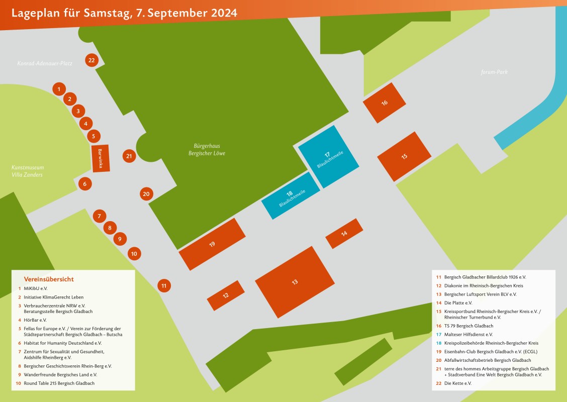 Unter dem Motto „Bergisch Gladbach international“ präsentieren sich auf der Vereinsmeile mit fünf Pavillons folgende Vereine und Arbeitskreise, gemeinsam mit dem Büro des Bürgermeisters: