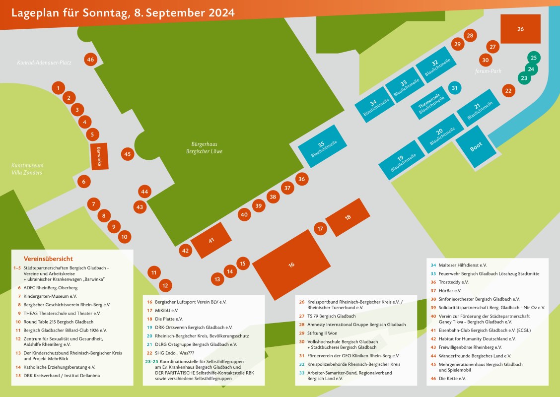 Die Vereinsmeile, beginnend vor dem Bergischen Löwen, stellt lokale Gemeinschaftsinitiativen und Vereine mit einem bunten Mitmach-Programm für kleine und große Kinder vor. Auf der Blaulichtmeile im Forumpark informieren Hilfsorganisation und Rettungsdienste über ihre Arbeit.