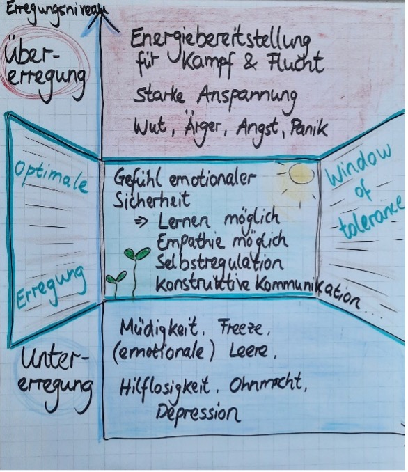 Dazwischen liegt der Bereich der optimalen Erregung – das „window of tolerance“. Hier können wir am besten auf jede Form von Reizen und Informationen reagieren und physiologisch funktionieren. Es überwiegt ein Gefühl emotionaler Sicherheit, aus dem heraus wir zu Selbstregulation und Empathie fähig sind. Außerdem sind wir in der Lage zu lernen und konstruktiv zu kommunizieren.