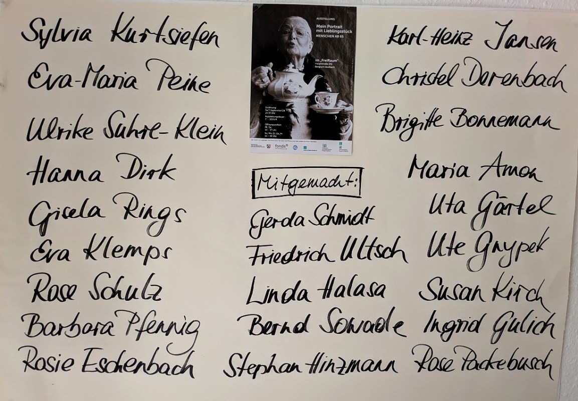 Zunächst wurden mit Hilfe der VHS, dem PROTreff in Bensberg und dem Mittendrin der Caritas Freiwillige gesucht, gefunden und dann über einige Monate hinweg mit dem Thema des Alterns konfrontiert. Vehikel waren dabei persönliche Lieblingsstücke, die jetzt mit auf den Porträts zu sehen sind. Zum Beispiel die inzwischen verstorbene Gerda Schmidt, die mit ihrer Teekanne und Tasse fotografiert wurde und jetzt das Plakat der Ausstellung schmückt.