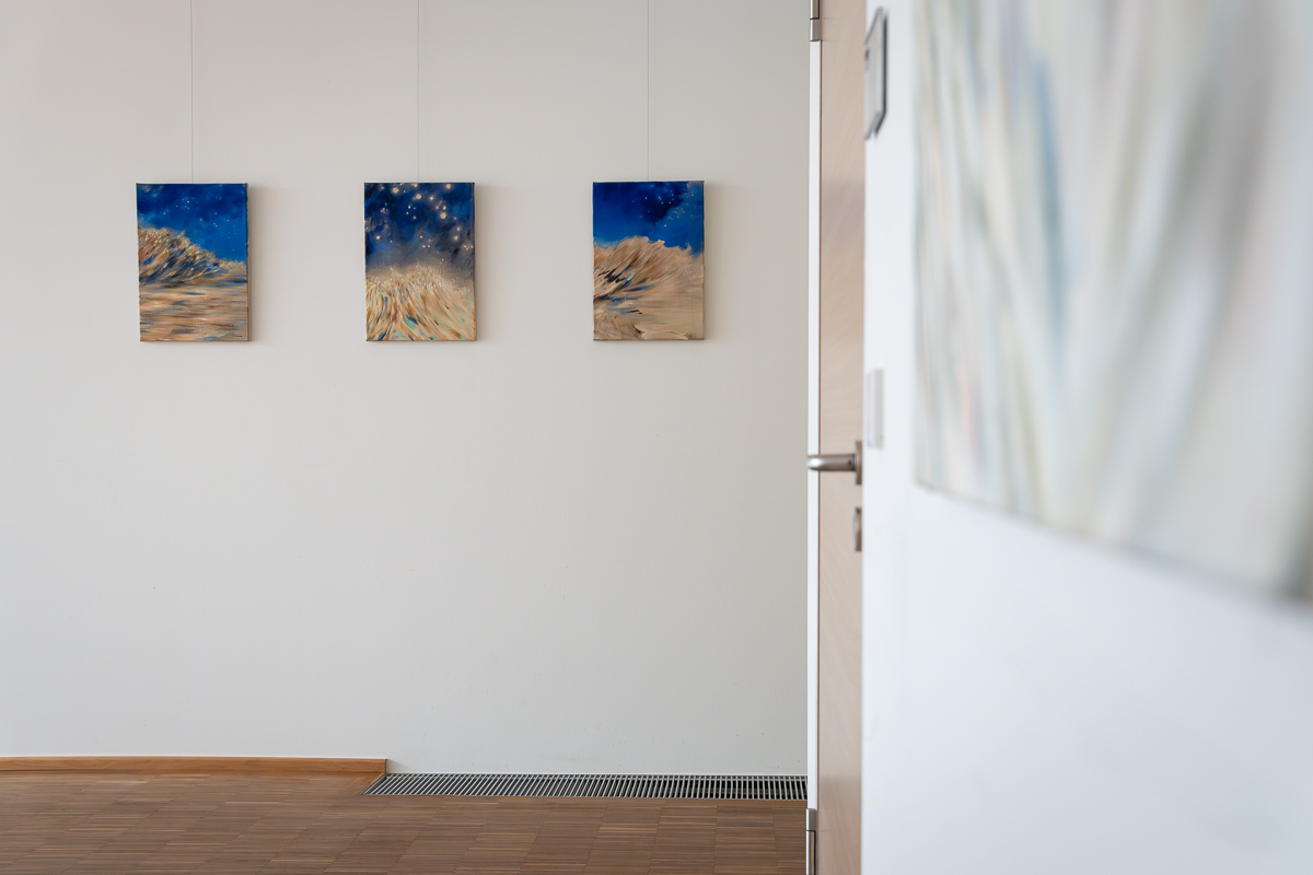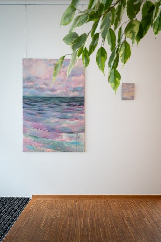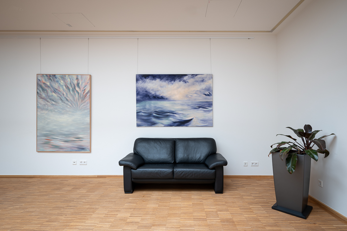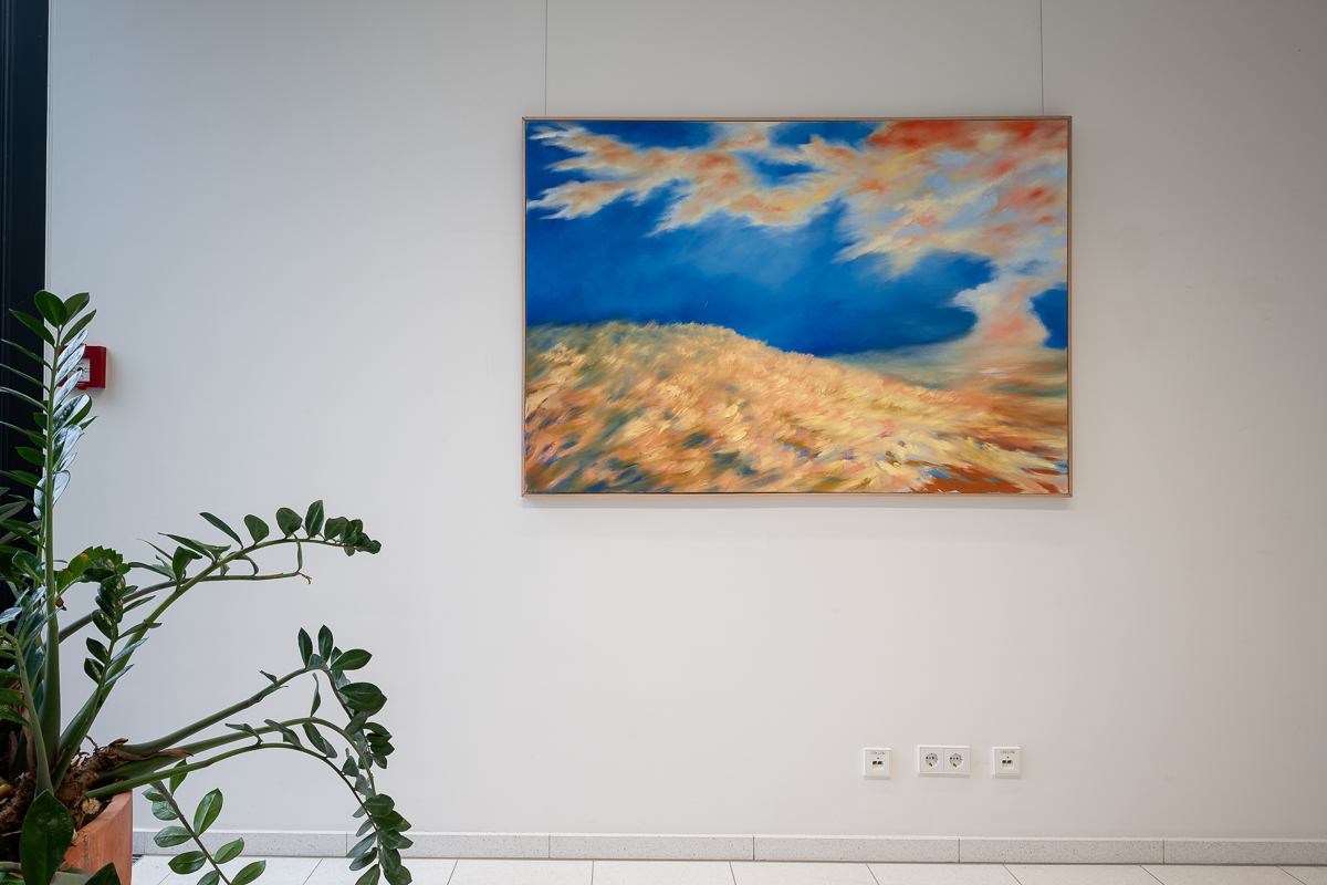 Sie malt vor allem Landschaften – eher Seelenlandschaften, so wie sie es auch musikalisch zelebriert – für sich und auch gern für ein Publikum, denn auch ihre Malerei braucht eine Bestimmung. Ein Blick auf die Homepage offenbart ihre eigene Bilder-Klang-Welt aus surrealen, träumerischen und fein nuancierten Seelenwelten. Einen Behördengang im Kreishaus kann man genüsslich mit Warten verbringen.