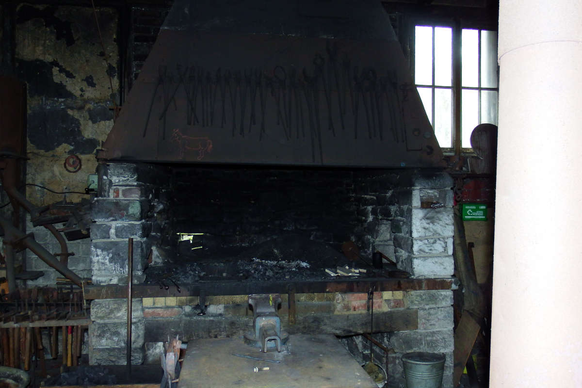 Die Schmiede stand früher im Ort Lindlar. Dort wurde sie vom Schmiedemeister Willi Anhalt betrieben – der Pferde beschlagen und landwirtschaftliche Geräte wie Pflügen und Eggen repariert hatte, aber auch Wagenräder. Das ganze Haus quillt über von handwerklichen Geräten und Maschinen. An der hinteren Wand dominiert die große Feuerstelle.