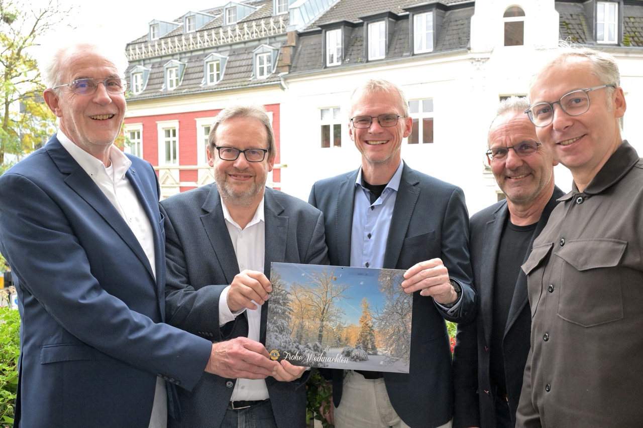 Die Lions-Vorstände .Wolfgang Dick,Marcus Fehler, Hubertus Wiesenhof und Oliver Schillings überreichten den ersten Kalender an Bürgermeister Frank Stein. Foto: Stadt GL