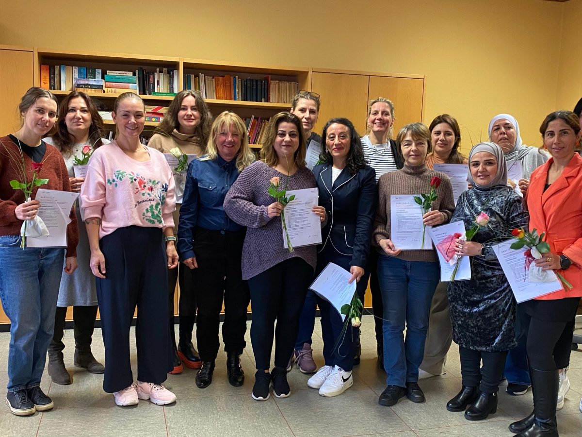 Die Kurs-Teilnehmerinnen in Bergisch Gladbach stammen aus der Türkei, aus der Ukraine, aus Syrien oder Aserbaidschan. Entwickelt wurde dieser Qualifizierungskurs vom AWO Bezirksverband Ostwestfalen-Lippe, das Bildungswerk der AWO in Bergisch Gladbach hat das Konzept gerne übernommen.