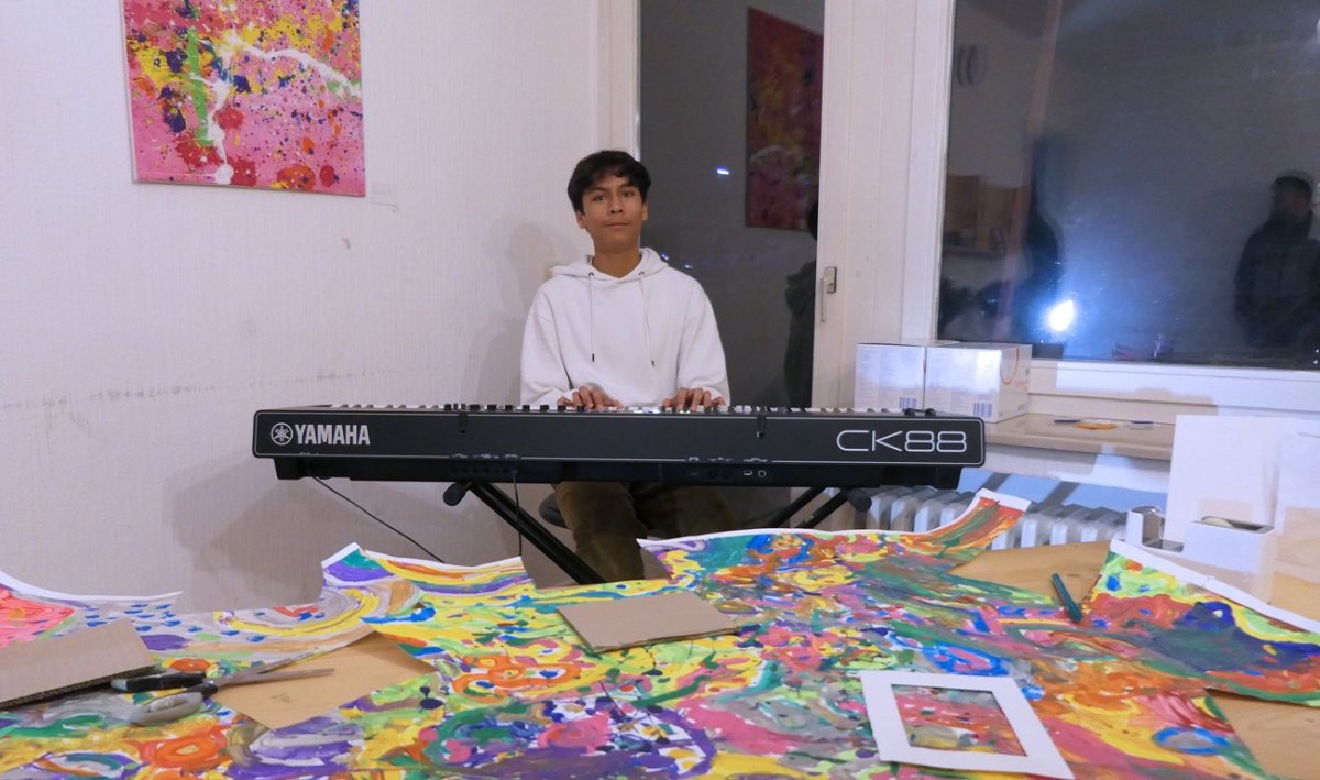 In lockerer, geselliger Runde – mit schwirrendem Sprachengewirr und perlendem Sound (Theo, Keyboard) –  startete die ausführliche Betrachtung der Kunstwerke, die Wände und Tische schmückten. Aufmerksam nahmen die Erwachsenen die Arbeiten in Augenschein und erfuhren die Hintergründe zu Porträts, Landschaften, Straßenszenen, Pyramiden, Objekte/Zukunftsvisionen. Viel Lob bekam die 16jährige Arina für ihre Arbeit – für das Porträt von ihrem jüngerem Bruder.