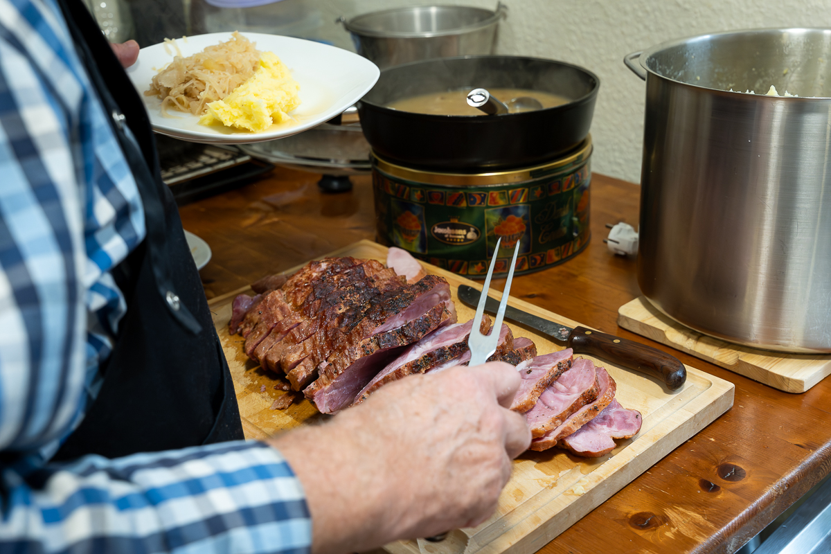 Woche für Woche kochen zwei Senior:innen deftige Hausmannskost. Heute gibt es Kassler mit Kartoffelpüree und Sauerkraut – zubereitet von Rudolf Fiedler. Kochen bezeichnet der 67-Jährige als Hobby. Einmal im Monat steht er in der Küche von „Mittendrin“.