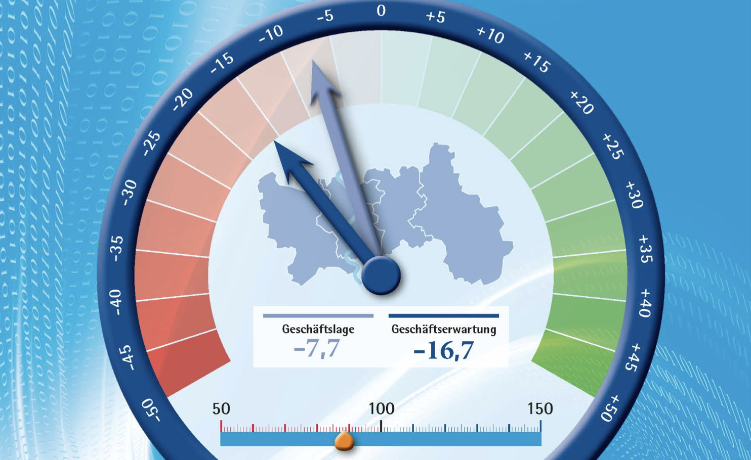 Hier bei uns verschlechtert sich die wirtschaftliche Lage weiter. Der Lageindex sinkt von -7,3 auf -7,7. 28 Prozent der Unternehmen bewerten ihre Geschäftslage als schlecht, nur 20 Prozent als gut. Auch die Erwartungen für die nächsten 12 Monate verschlechtern sich weiter. Der Index sinkt hier von -15,8 auf -16,7 Punkte. 29 Prozent rechnen mit einer Verschlechterung, 59 Prozent erwarten keine Änderungen, nur bei 12 % gibt es Hoffnung, dass es besser wird.