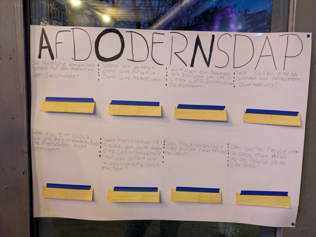 Nur um das richtig zu verstehen: Es geht euch um die Passage, in der ein Jugendlicher gemeinsam mit einer Mitarbeiterin ein Plakat erstellt hat, auf dem Aussagen von AfD und NSDAP präsentiert werden und man zuordnen soll, von welcher Partei welche Aussage stammt? Dabei hat sich herausgestellt, dass die dort ausgewählten Passagen nur schwer unterscheidbar sind. Ihr stört euch aber nicht daran, dass die AfD wie die NSDAP klingt, sondern daran, dass Menschen das öffentlich thematisieren?