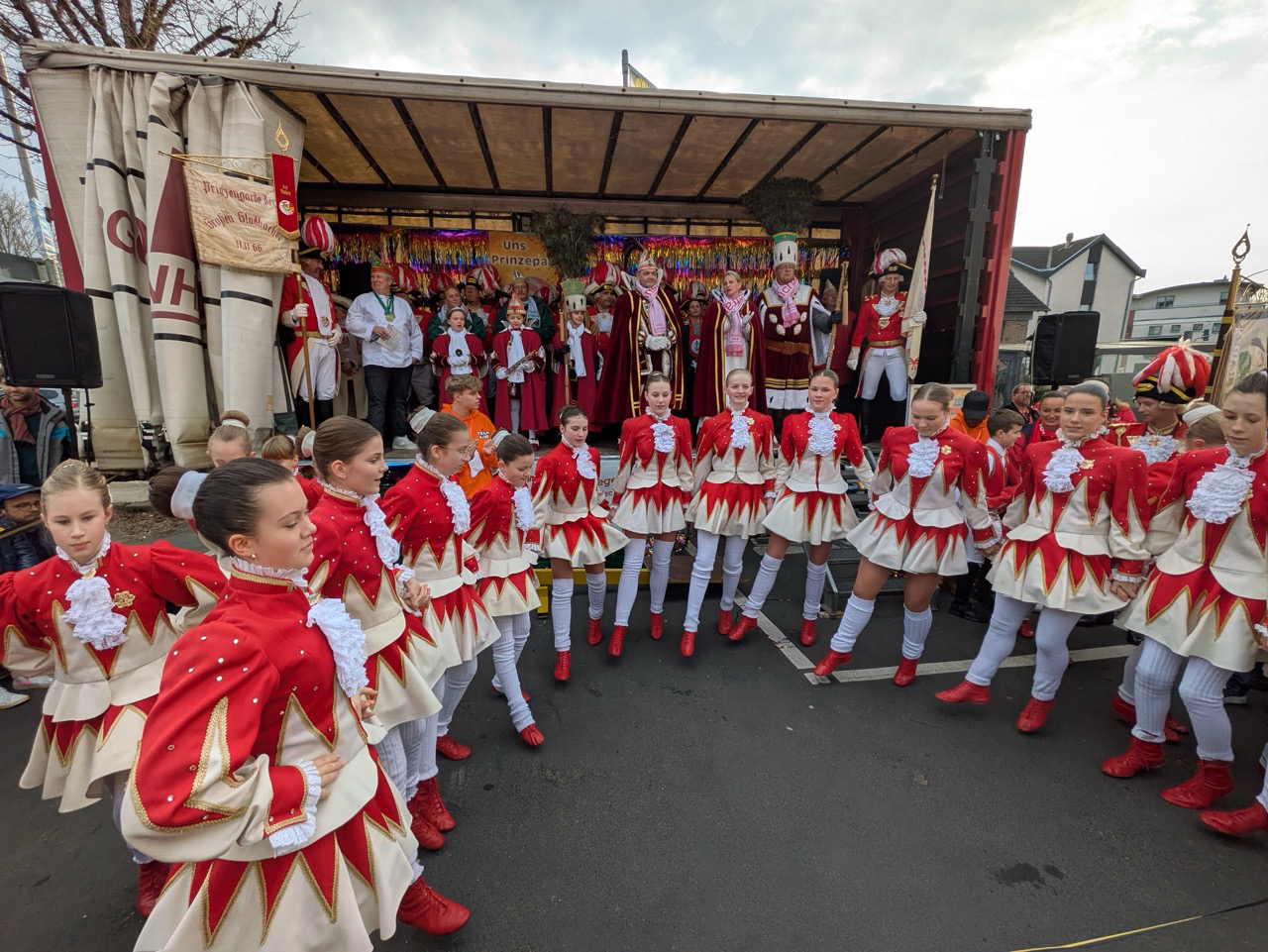 Dann wird es voll auf der Bühne, als Peter Lob die Prinzengarde der Großen Gladbacher, das Kinderdreigestirn und das Erwachsenen-Dreigestirn zu sich bittet. Die Schlossstadt Pänz der Großen Bensberger KG begeistern mit ihrem Sessionstanz.