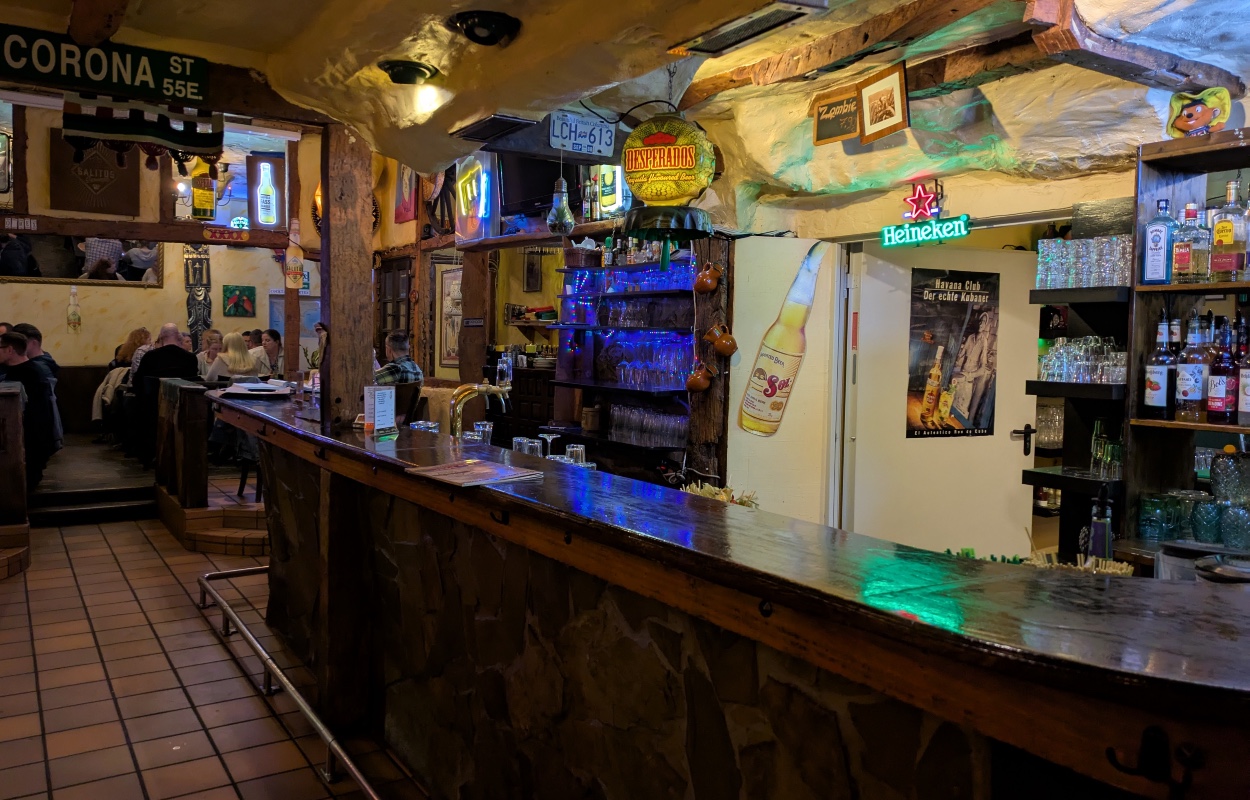 Das Taco Mex ist bunt und etwas schrill: An den Wänden hängen Sombreros und bemalte Holzmasken – und auch sonst gibt es in jeder Ecke und in jedem Regal allerlei Deko, Leuchtreklamen und Klimbim zu entdecken. Überfrachtet mögen das Minimalisten nennen. Aber es trägt zum besonderen Ambiente bei.