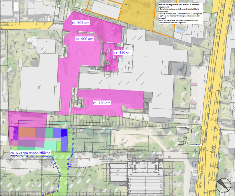 Im hinteren Bereich des Geländes der Realschule, im Plan in bunten Farben markiert, soll eine Erweiterung des AMG gebaut werden. In lila sind die Außenflächen der Realschule markiert, unten ist das AMG zu erkennen, rechts in gelb die Straße „Kaule“. Foto: Screenshot Ratsinfosystem GL